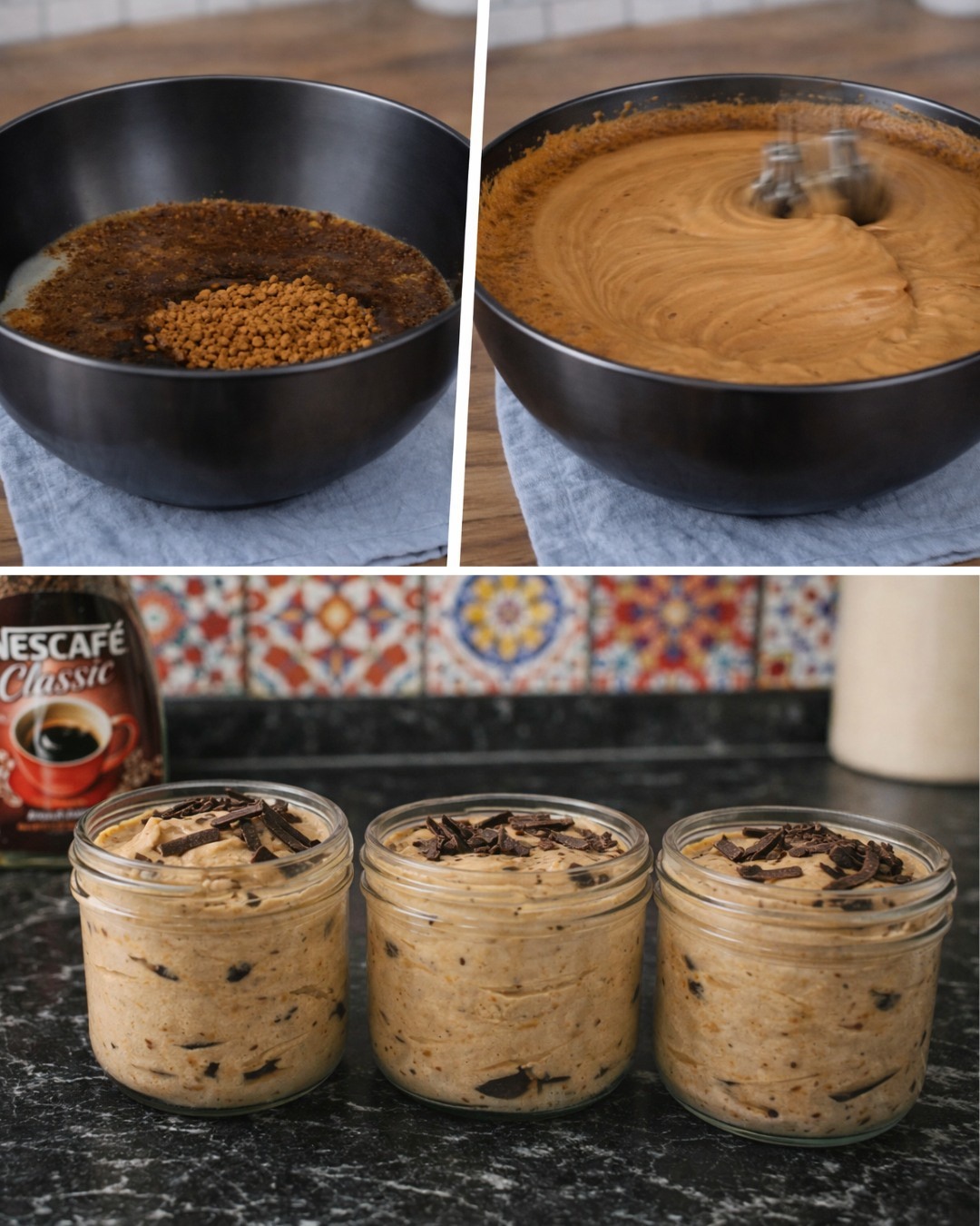 1️⃣ Przygotuj bazę kawową: mus kawowy podawany w eleganckim szkle, udekorowany startą czekoladą i chrupiącym ciasteczkiem.